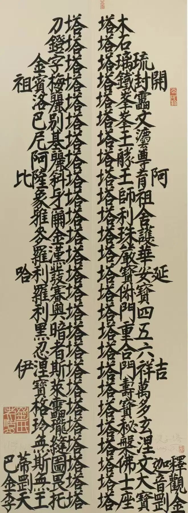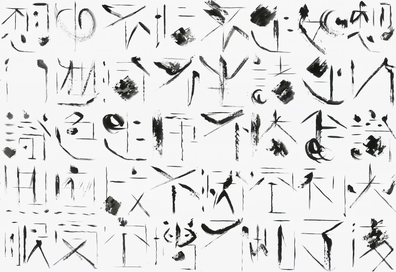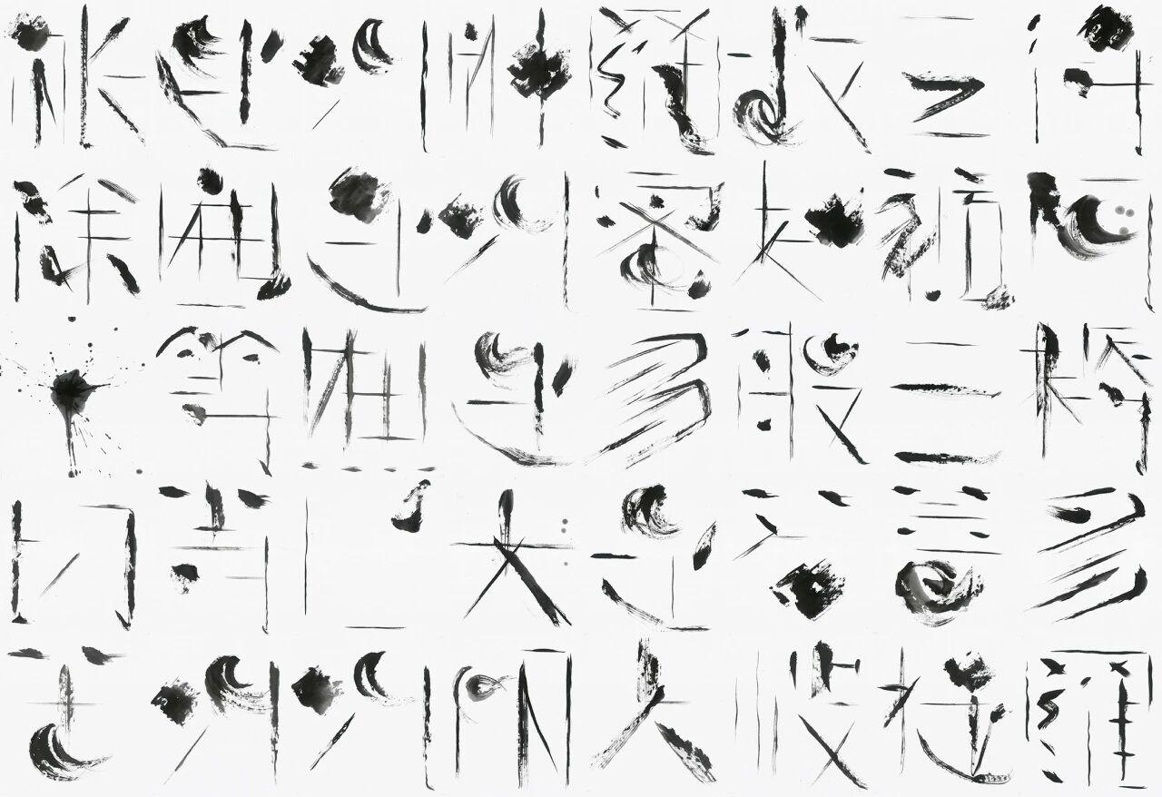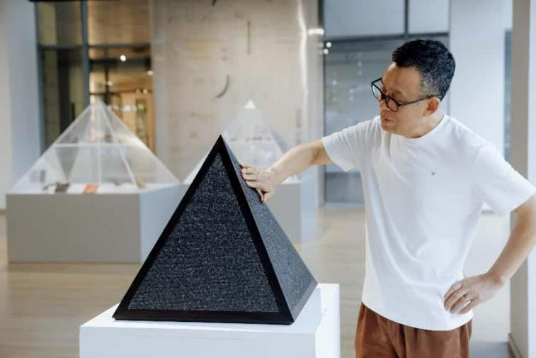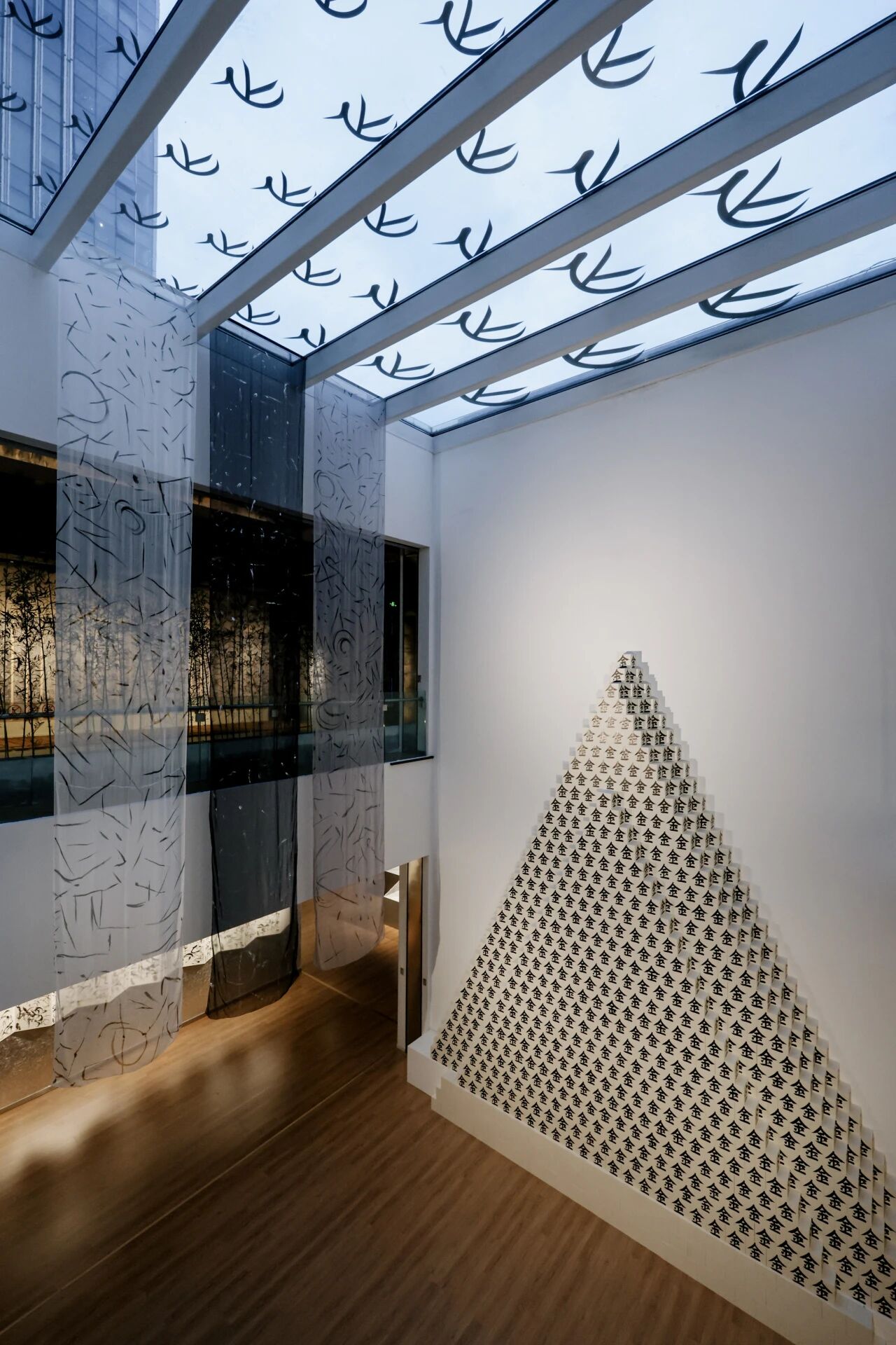 类似的“谐音梗”游戏,在“九宫格”系列、“金字塔”系列以及为本次展览新作的《浏阳曲,庐山高》系列中都有出没,在《双塔》中,艺术家将中文所有带“塔”的词汇以传统由上至下的列序并置;现场构建的金字塔装置,以“金”字的堆叠构筑塔型;“飞”字在重复中还原其象形之初的高飞之势……秉承“更深地深入传统,更开放地面对世界”的理念,艺术家并不囿于在字音和文字游戏中构筑意趣,而是以语音为线索,让不同文化形态发明字形、构建意义乃至命名万物的思维方式在作品中发生奇异的碰撞,展开他对于书法与文化特性的重新审视与思考。