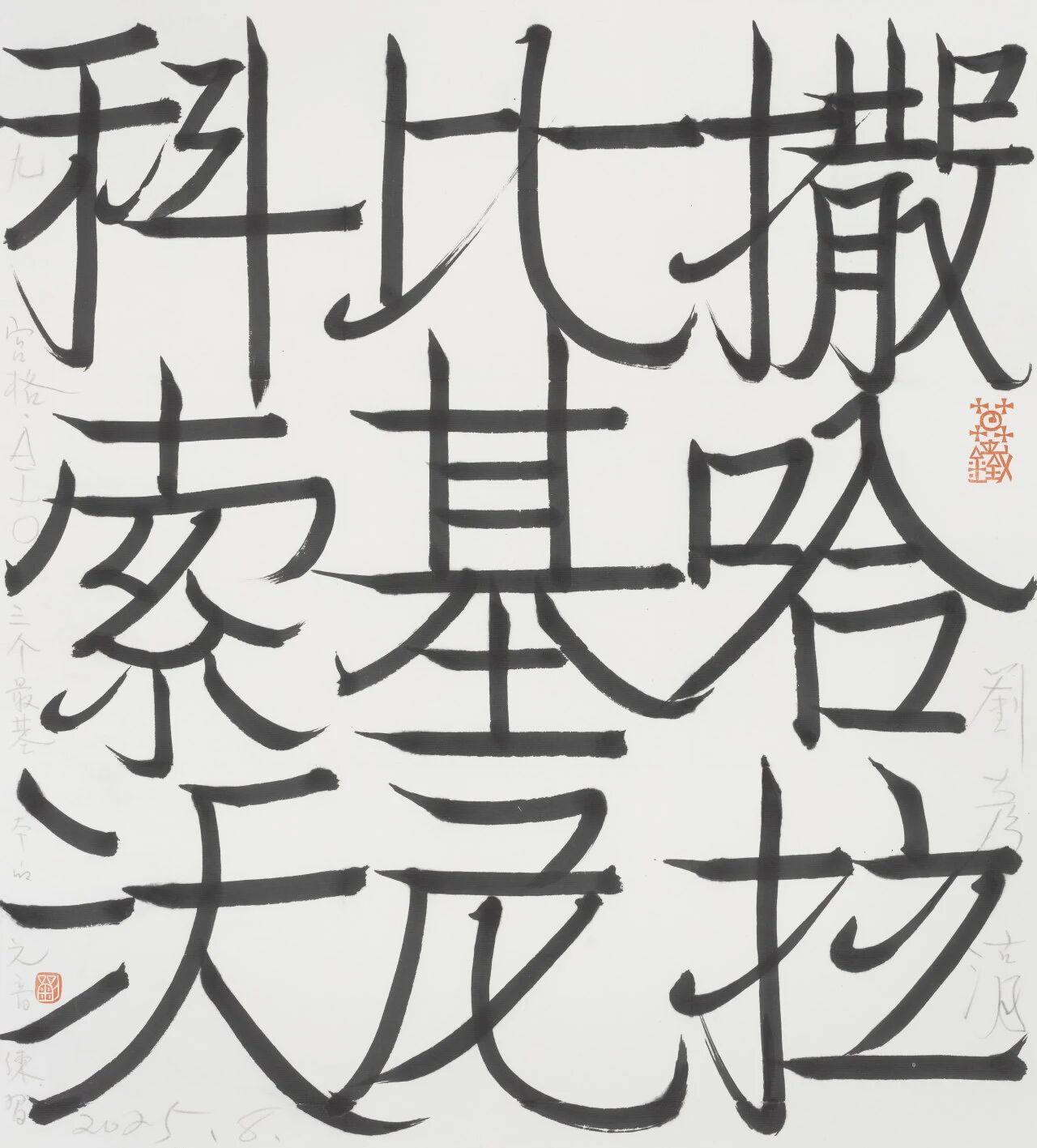 如陈斯鹏所说,“刘彦湖在‘正’与‘奇’,‘典型化’和‘陌生化’之间,一直在有意无意中作一种动态的平衡。”也构成了刘彦湖作品中耐人品味琢磨之处与化古为新的“现代性”面向。另一方面,对于书法现代性的探索,也建立在艺术家拥有的物理学、古文字、古埃及学的学术基底之上,以物理学的理性系统奠定认知框架,以考古学、文献学、语言学、历史学知识涵养书法创作,古埃及学则带给他跨越文化,开放胸襟的全球性视野,构成其当代创作意识的某种核心——以一种新的时间与空间观念,重新审视中国传统中的文化底层逻辑。