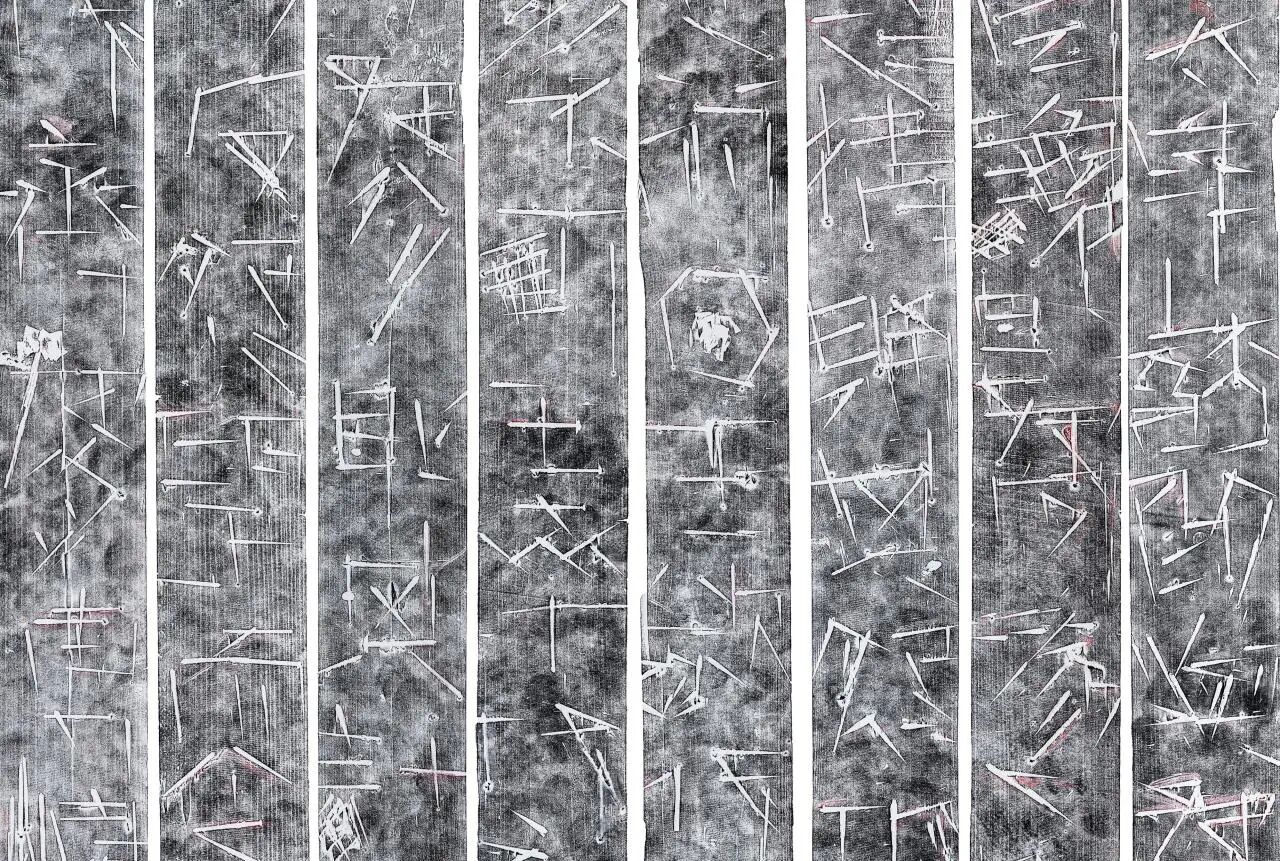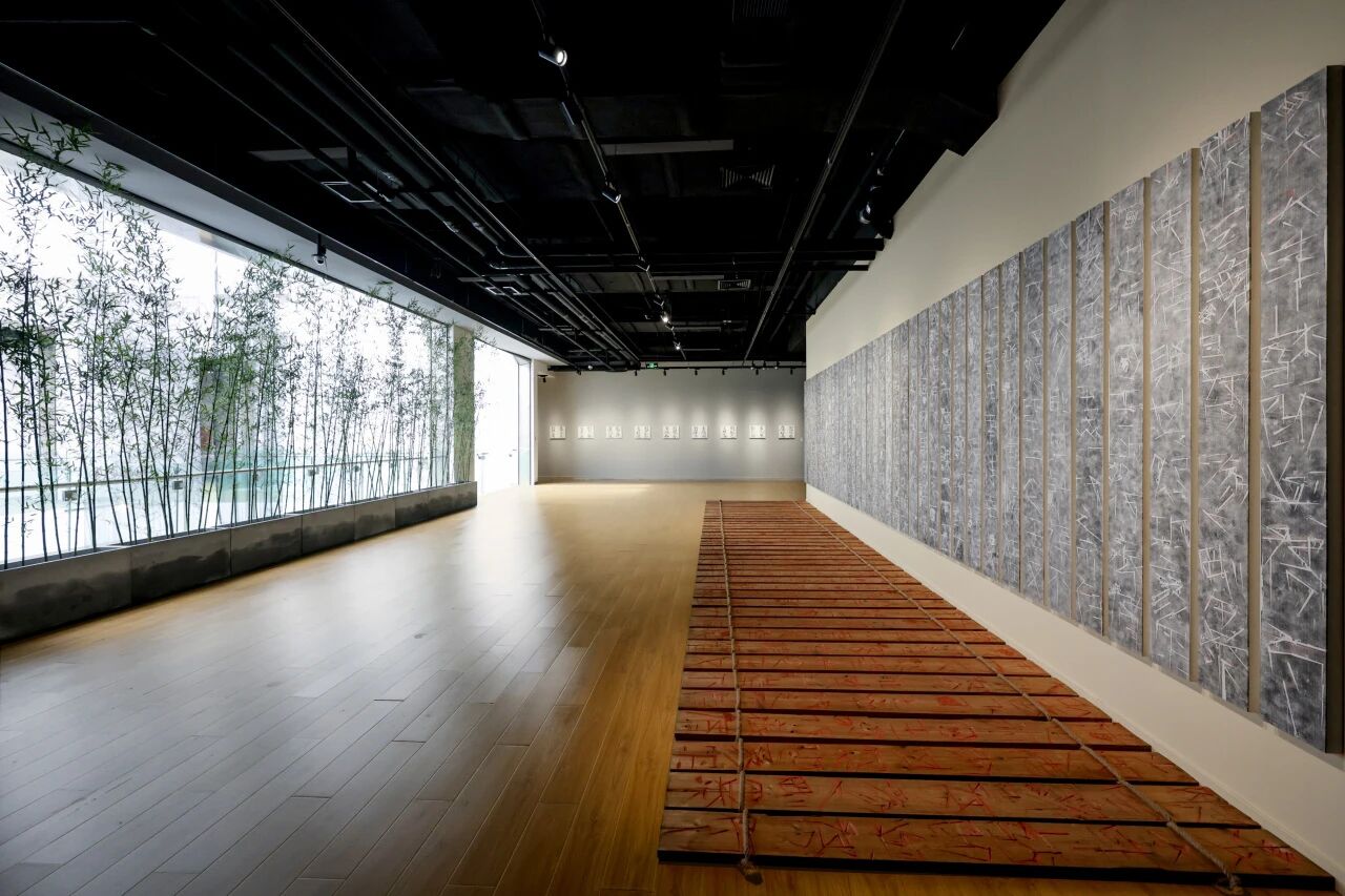 展览中的一件旧作,2018年曾在苏州博物馆展出的《吴越春秋》,大概早已表明卢俊舟从不缺乏探索和突破的勇气。木条由麻绳穿起,如同巨大的楚简,艺术家将《史记·伍子胥列传》中记录的一段悲剧故事,先以朱砂在木条上写就,再以刀劈斧砍加深文字痕迹,继而衍生出墙上呈现的拓本。铺开的木简“装置”,和艺术家无法简单归纳为“书写”的行为,共同构成了《吴越春秋》既散发高古决绝的精神性,又富当代性的艺术感染力。