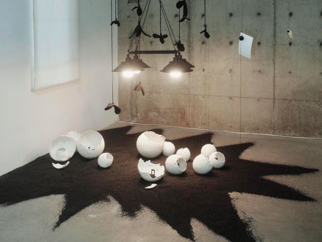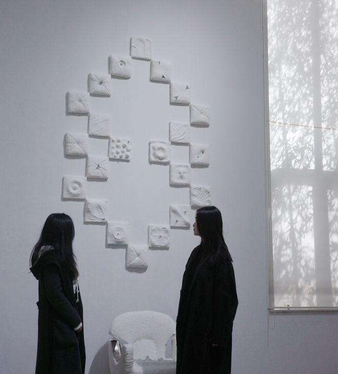 95后宋若芯&王晨皓及他们的导师卢英英带来了展览《房间里的椅子》,是他们2021年至今以来以纸浆包裹进行创作的一系列实验。那些捡来的被废弃的椅子,被他们以柔软的纸浆包裹后有了坚硬了的“壳”,仿若自我追问以及与现实世界交集产生的冲突与化解。M房间大空间挑高5.65米,非常考验艺术家。“房间里的椅子”带来丰富的叙事,里面包含很多“故事”,如“初生”、“西西弗神话”、“觉”、“共生花园”、“我们这么在一起”、“伤痛图鉴”等多组/件作品。特别要提到作品“局部气候”是根据空间场地特别创作的, 因建筑已10年,防水系统需要进一步修缮,但目前无法解决,所以空间屋顶有一处一直漏水。三位艺术家根据这种情况,做了巧妙结合。卢英英也带来了她的两件作品《黑色蝴蝶的休憩》和《我是一只河蚌》,对骨盆、河蚌、胆结石等有机体进行了重塑。其中机械装置作品深受观众喜欢,也要提到作品中有一只蚌壳里是艺术家做胆结石手术,从身体里取出的“石头”。