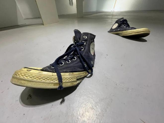 00后伽让个人项目《出走/过度呼吸》就是从自身到群体,关乎“性别身份”的讨论。他把M房间第二空间打造成一个大的卫生间,里面有厕所隔间、洗手池、小便池、淋浴间等。当他打算从父权的阴霾中出离,几双外八字的鞋提示出他自我矫正的困境。而一个被消声的影像作品,在讨论发声的话题;由彩虹旗剪下的红色部分拼接出的红色旗帜,是他的反抗。在“疯马秀”的闹剧里被提及的那个红唇小便池,到他的作品里变成一个象征男性的粗野的“嘴”,还有一幅“假牙”,又看到他的调侃和幽默。伽让22年刚从央美实验艺术系毕业,本次展览算作他毕业后首次比较正式的个展。非常优秀的表现,尤其是作品之间的展陈关系处理。