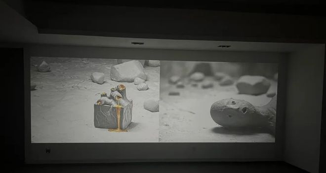 作品中大大小小的泥人在大屏幕上诞生、成长、死亡,同时行走和挣扎着朝向某个地方,这是尘世的空间,是普通人生活和栖息之地;这群泥人前仆后继地走向一个庞然大物,此物接纳或者吞噬它们。
