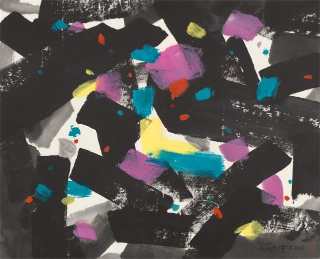 作品以点、面构成了一幅抽象的艺术世界。画面中的黑白色块相互交织奠定了基础,紫色、黄色、红色和蓝色的色点与色块以活跃的形态随意点缀。这些看似随意的色点与色块,浓缩了吴冠中对形式的概括与感悟。所有的具象都已化作抽象的元素,展现出一种律动和气韵。吴冠中以点、线、面的基本形式探索抽象的表达,此作主要追求“面”构成的艺术效果。从具象到抽象,吴冠中以自己的实践不停地探索,到晚年他以极为简练、概括的形式表达最本质的艺术情感,追求中国画现代化之路。