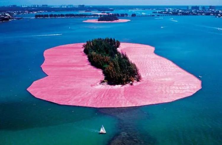 1980-1983年在迈阿密的“包裹群岛”(SurroundedIslands)用粉色尼龙轻柔的围绕绿岛边缘空中俯瞰犹如碧海漂浮的朵朵睡莲▼
