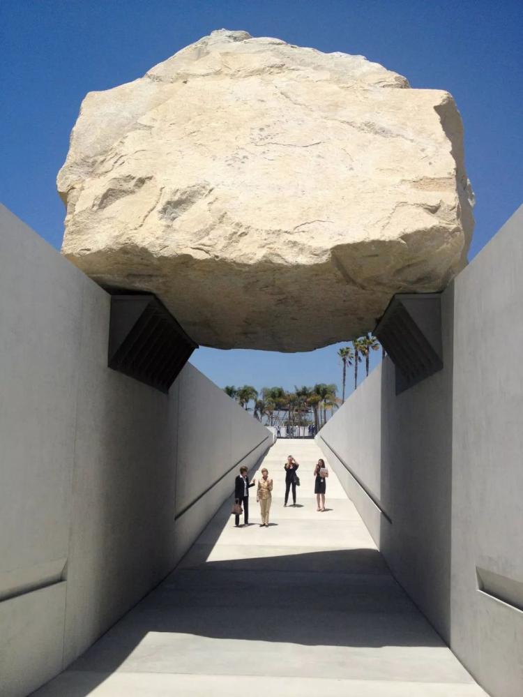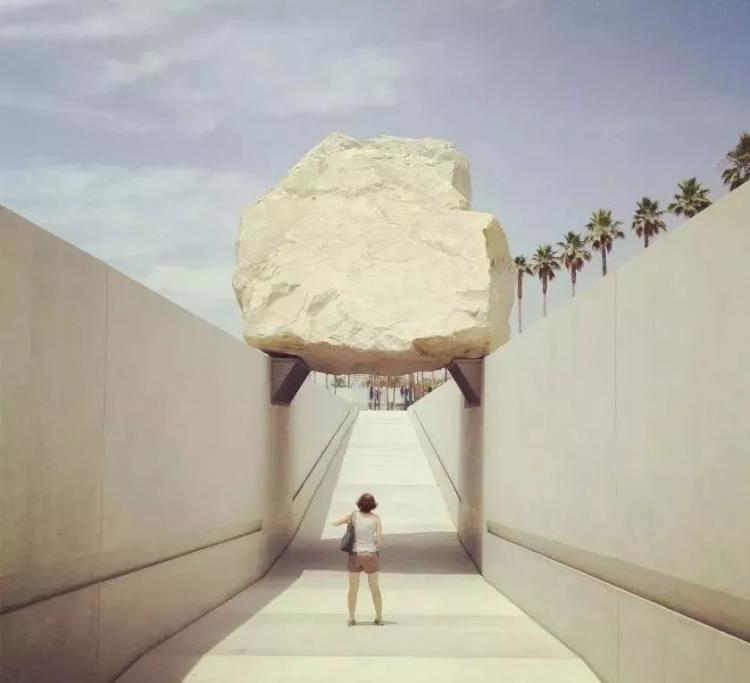 迈克尔·海泽于2012年洛杉矶郡立美术馆安装了名叫《Levitated Mass》的作品这是一个摆放于室外窄窄走廊内的340吨巨石▼